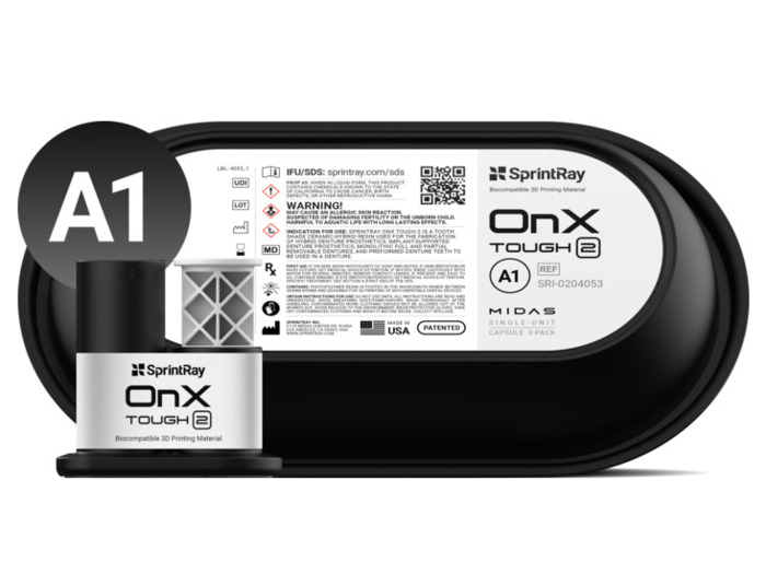 OnX Tough 2 od SprintRay je vysoce pevná kapslová pryskyřice určená pro výrobu implantátových suprastruktur a náročných protetických prací, zejména full-arch rekonstrukcí.